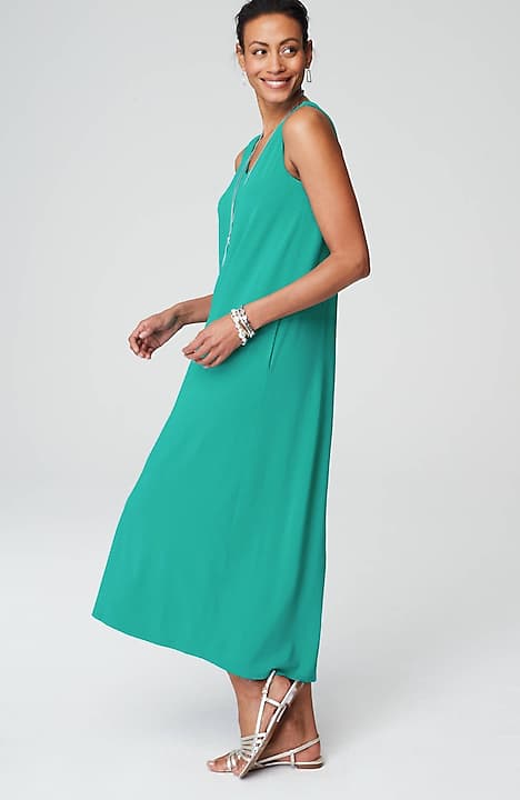 Winner: most effortless spring dress. In a light, breezy silhouette, designed with a graceful elliptical hem, cross-back detail, subtle cutout and on-seam, stitched-through pockets. Designed to wear through the season and well into summer.