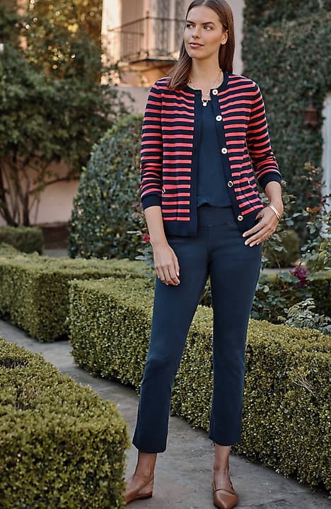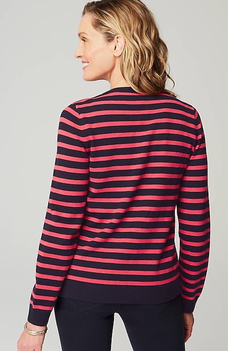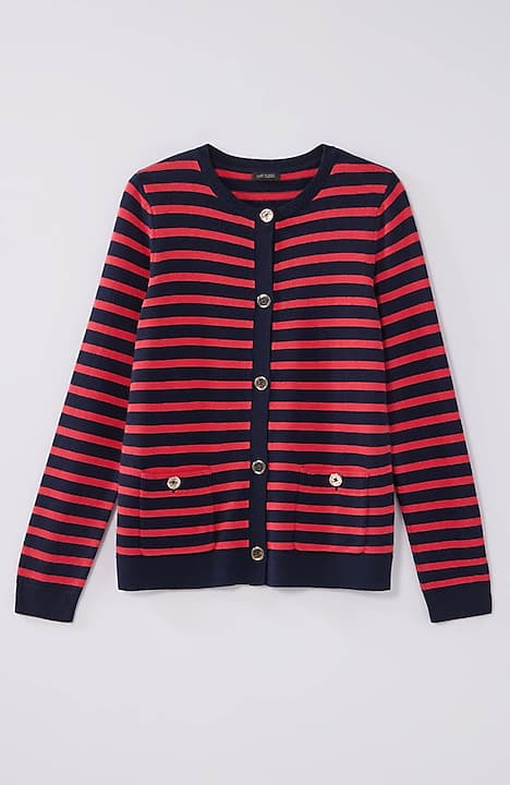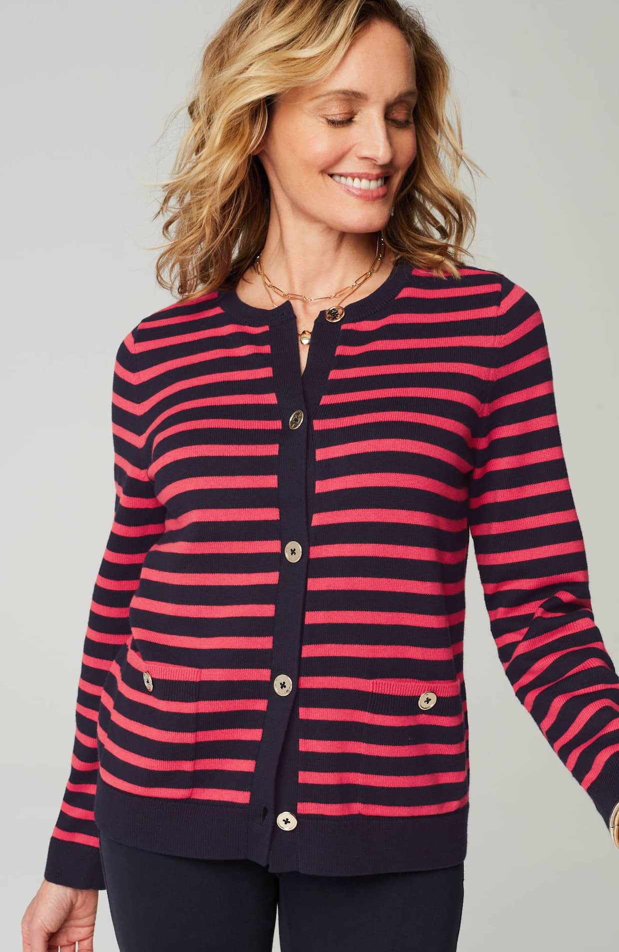 We love a great stripe—especially in this eye-catching color combo. Finished with ribbed trim, pockets and metal buttons for extra glow. Layer it your way.