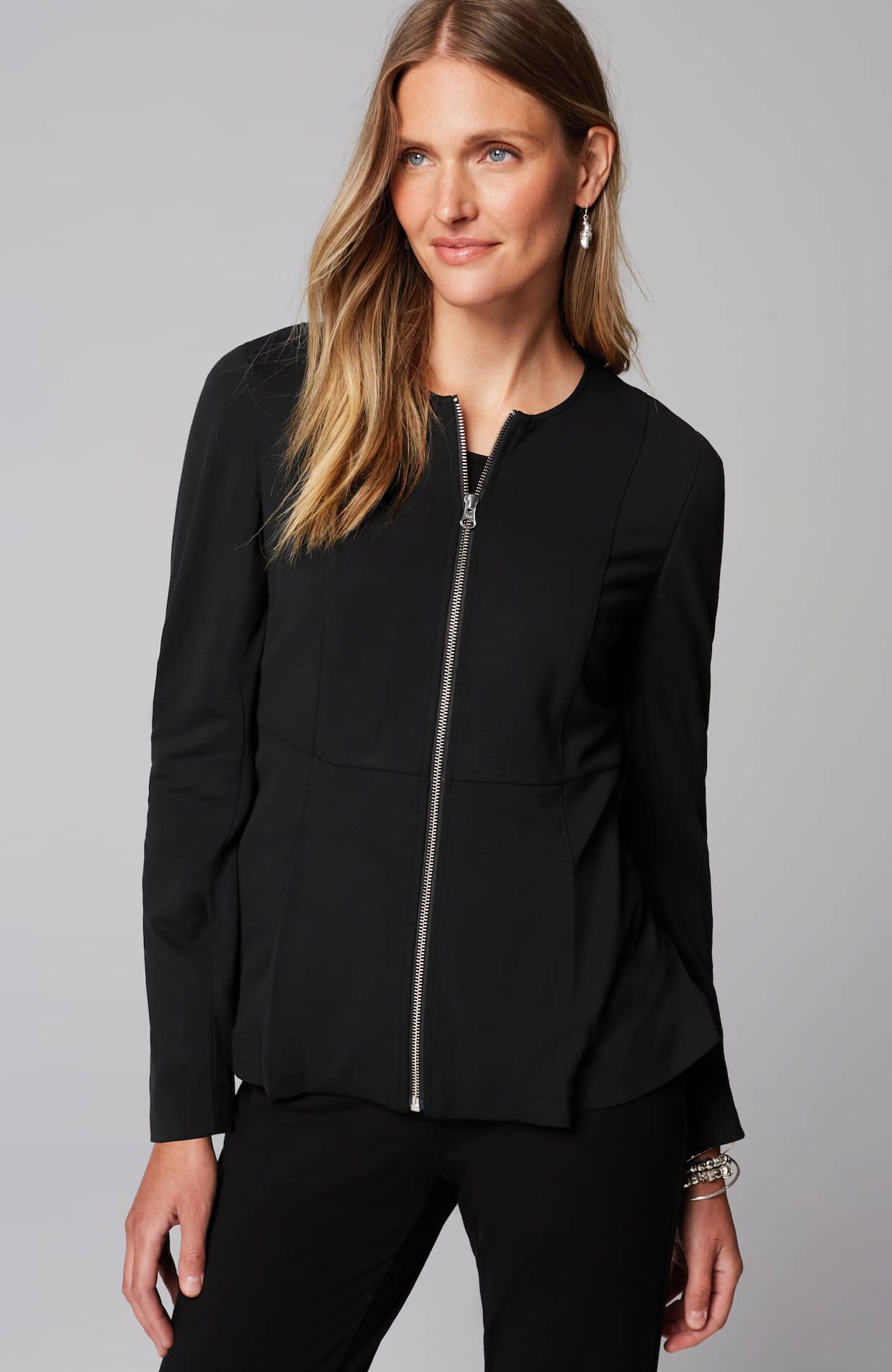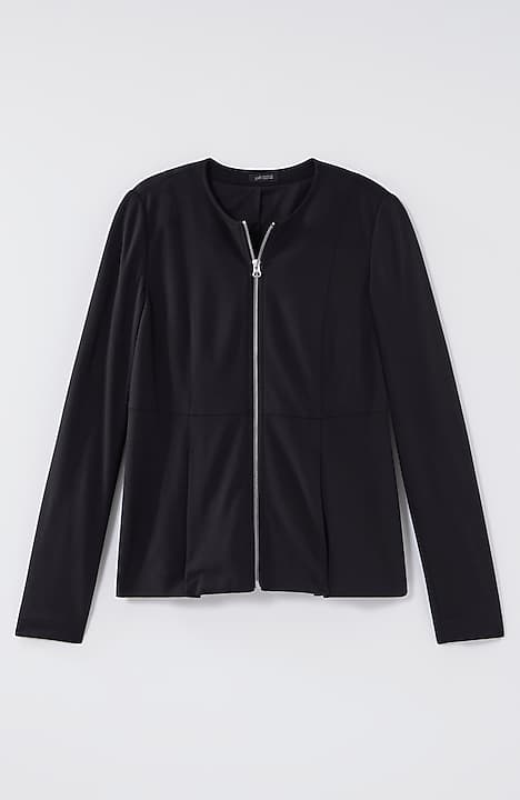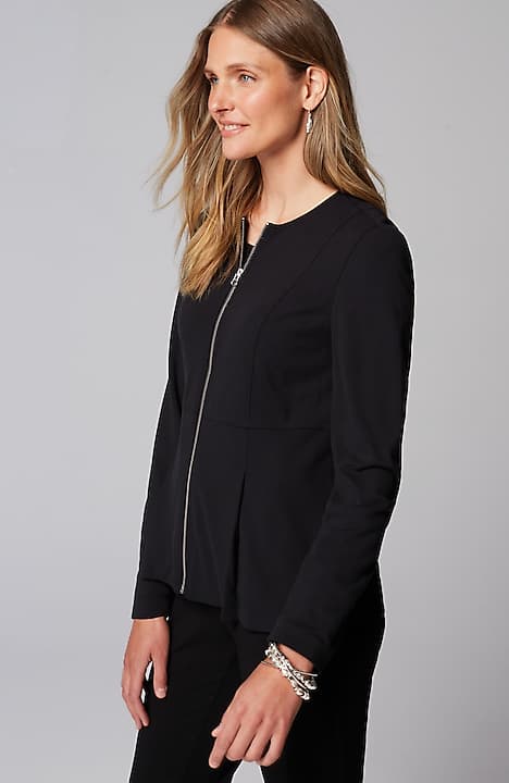 Part of our Wearever Works Collection, our cropped, full-zip jacket is the ideal layer to add to your wear-now wardrobe. Crafted from our soft yet structured double-face jersey fabric, it’s both refined and supremely comfortable. We added princess seams and peplum-style pleats for a touch of fun. Fully lined.