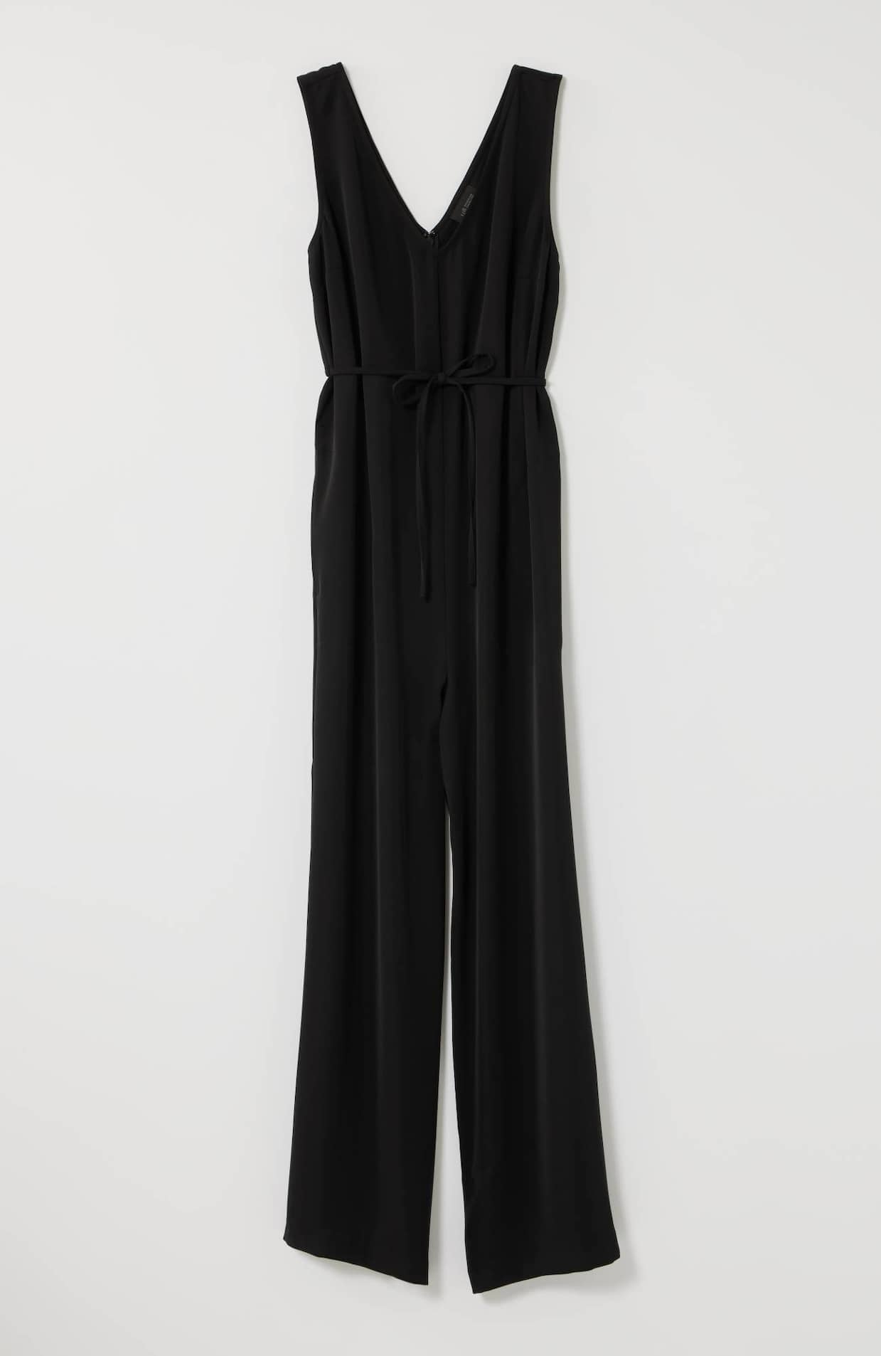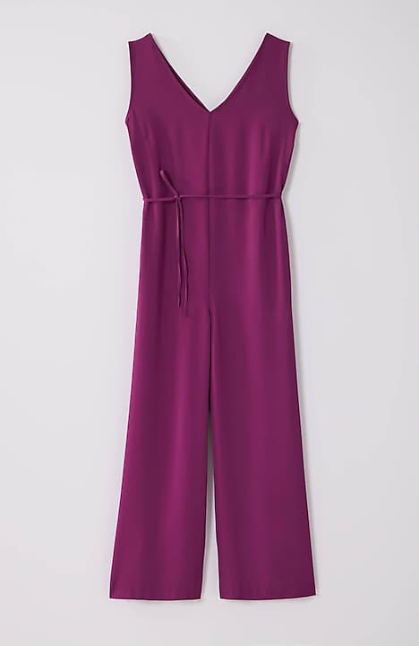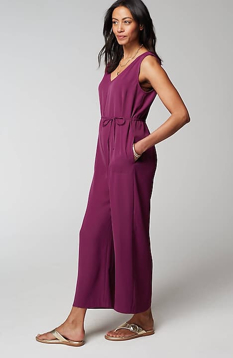 One-and-done dressing takes on a whole new level of comfort with our easy-care twill jumpsuit. You'll love the stylish double-V-neckline, while the cropped length lets you show off summer sandals or sneakers. The self-tie belt with channeled elastic at the back creates a custom flattering fit. On-seam pockets are perfect for holding small essentials. Invisible zipper at the center back. Sleeveless.