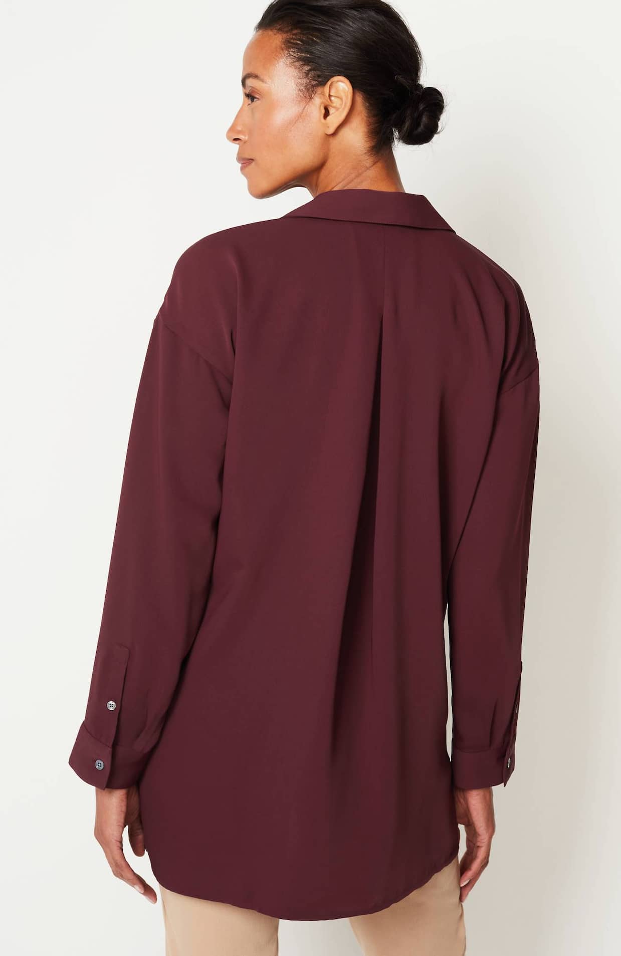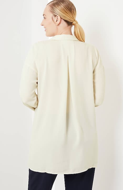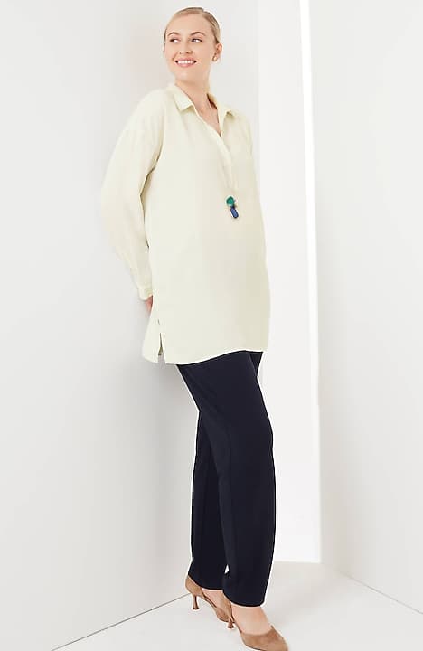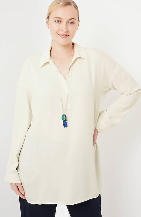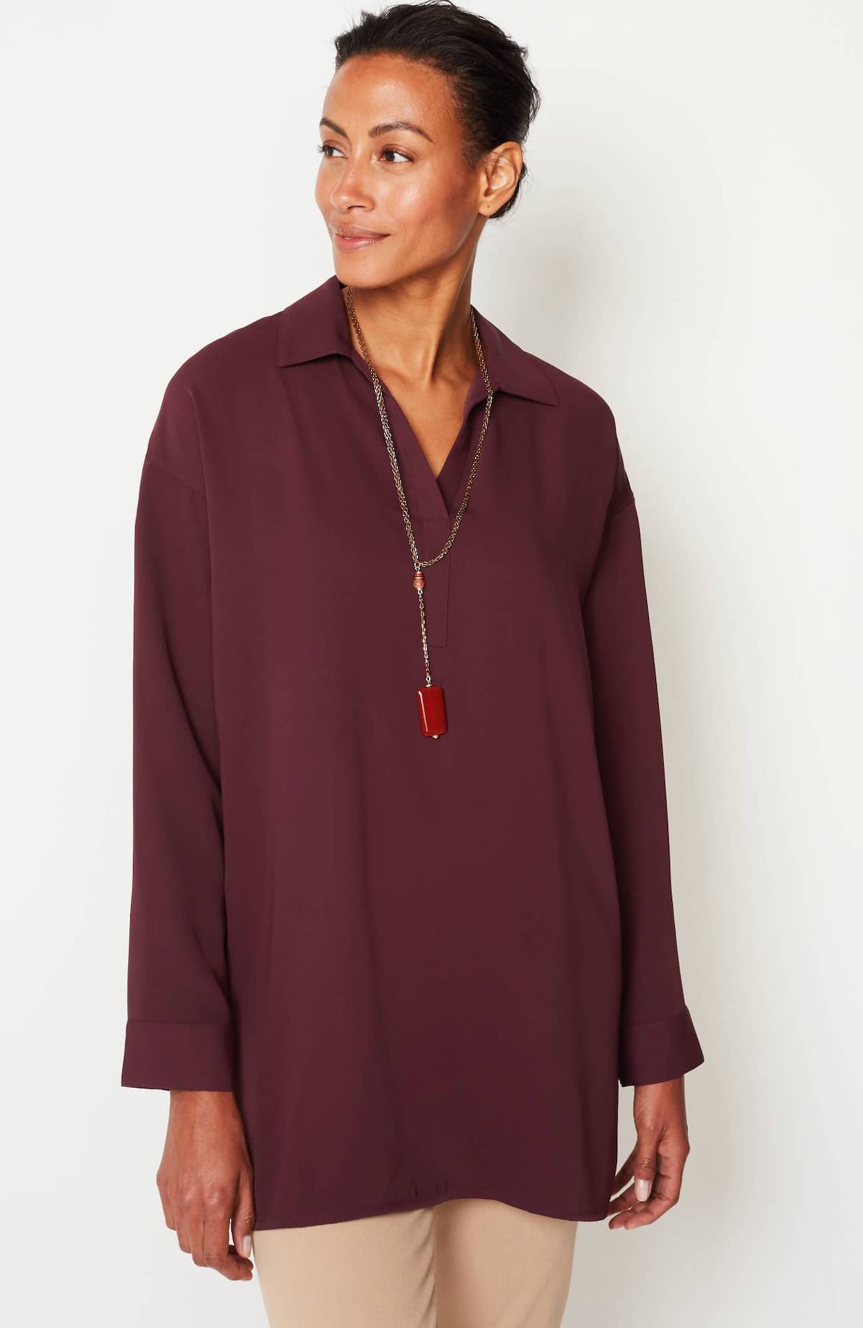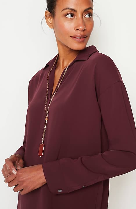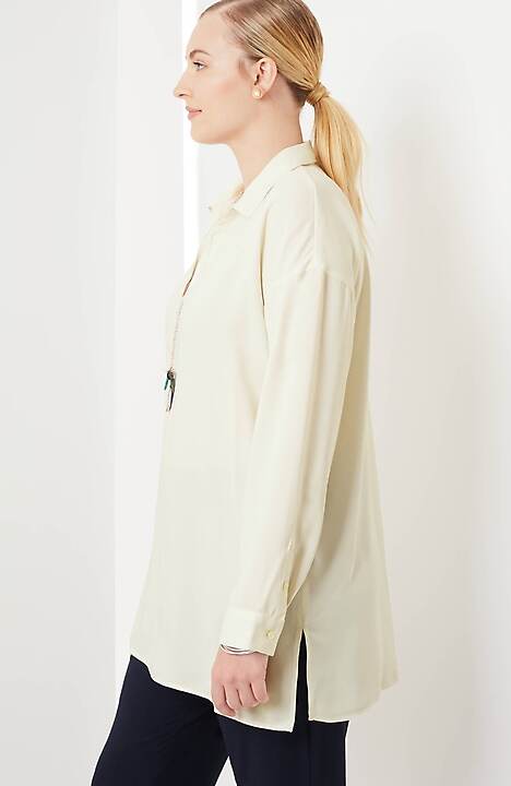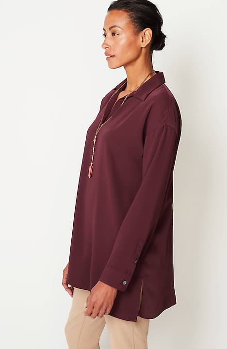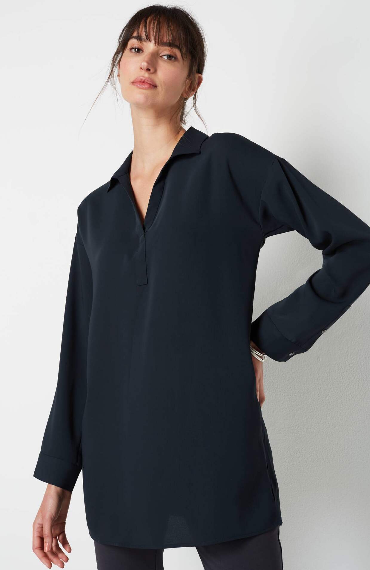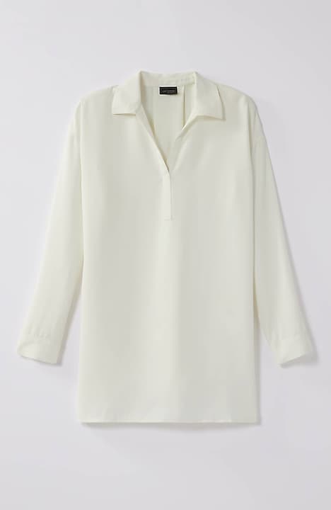 Designed in our lightweight easy-care woven fabric, our tunic is an effortless, any-season style. The easy-care fabric makes it perfect to pack for long weekends away. It combines an easy, flattering A-line shape with everyday comfort and versatility that goes from workdays to weekends with leggings, pants, jeans or a skirt. Split neckline. Mother-of-pearl at the sleeve cuffs. Side vents.