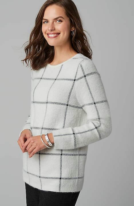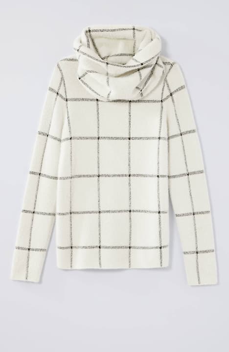 This year's softer-than-ever sweater,  with a detachable snood hood, in a refined windowpane jacquard pattern.